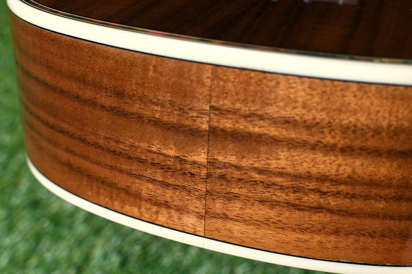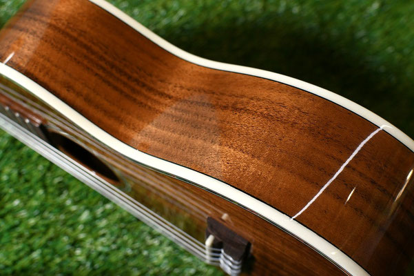 シンプルなスタイルの中にもグリーンパール柄のロゼッタとパーフリングにホワイトバインディングを採用したモデル。