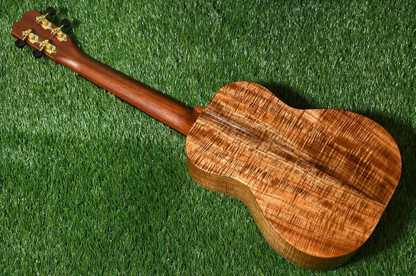 こちらはハワイアンコアの杢目とヘッドのインレイが美しいKanile'aのカスタムモデルのテナーサイズです。
