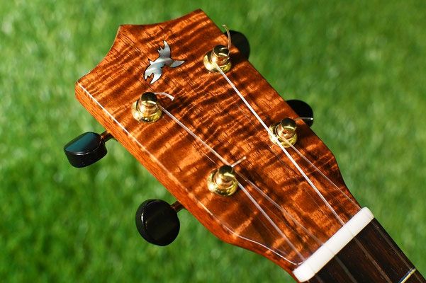 美しい杢目とグロス塗装、貝殻のロゼッタとヘッドロゴ、ゴールドペグが相まって高級感がありますね。