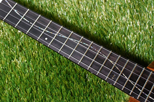 装飾面ではアバロンロゼッタと指板にライン状のアバロンインレイが施され、