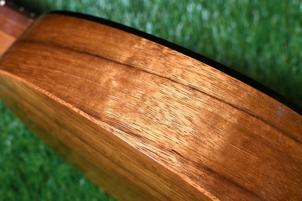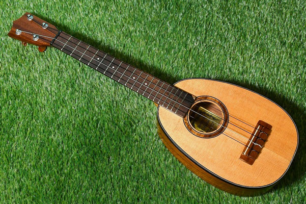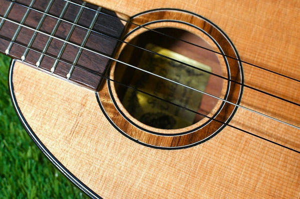 トップは針葉樹系の材、サイドバックにはハワイアンコアを使用しており、前に音が飛びやすいコロコロとしたサウンドです。